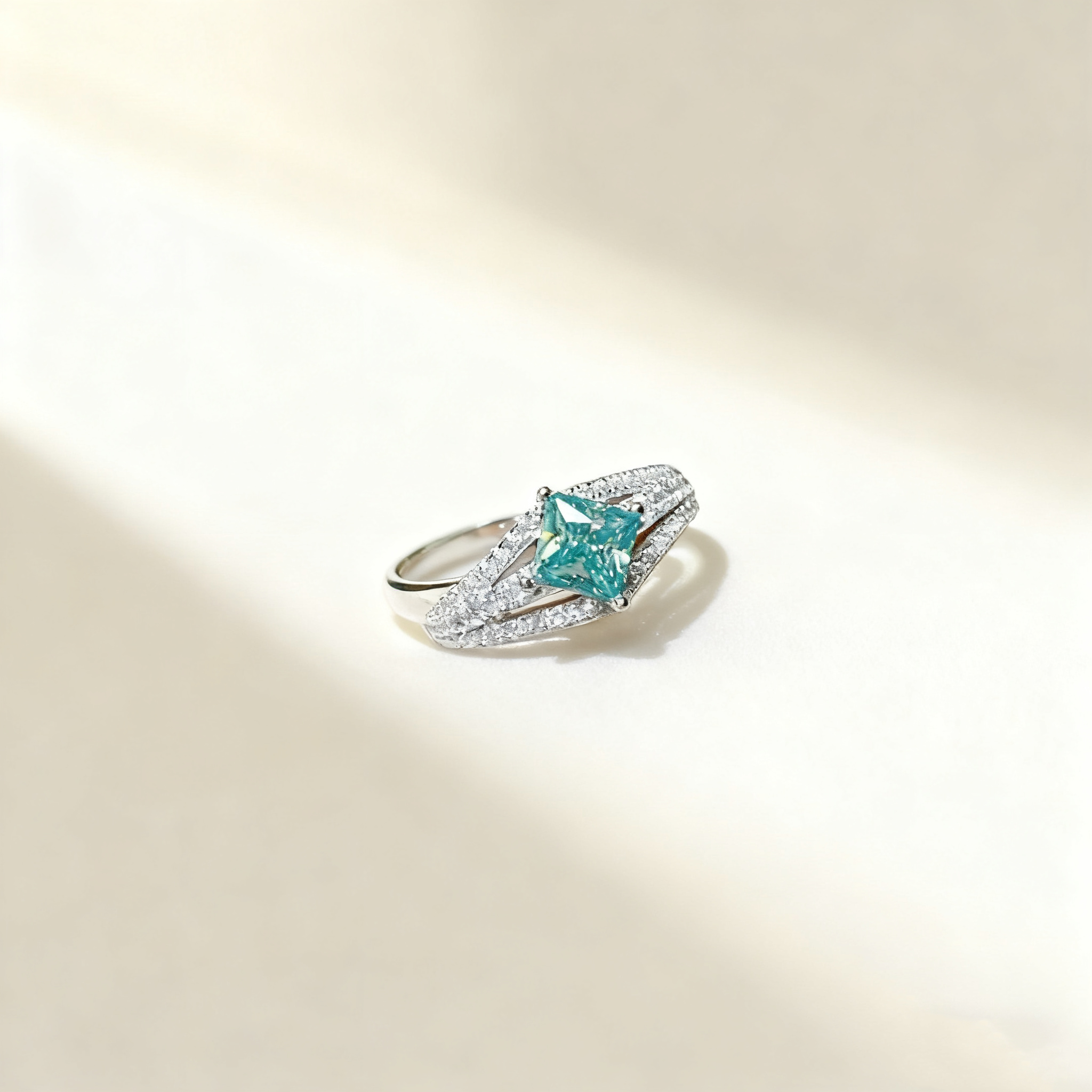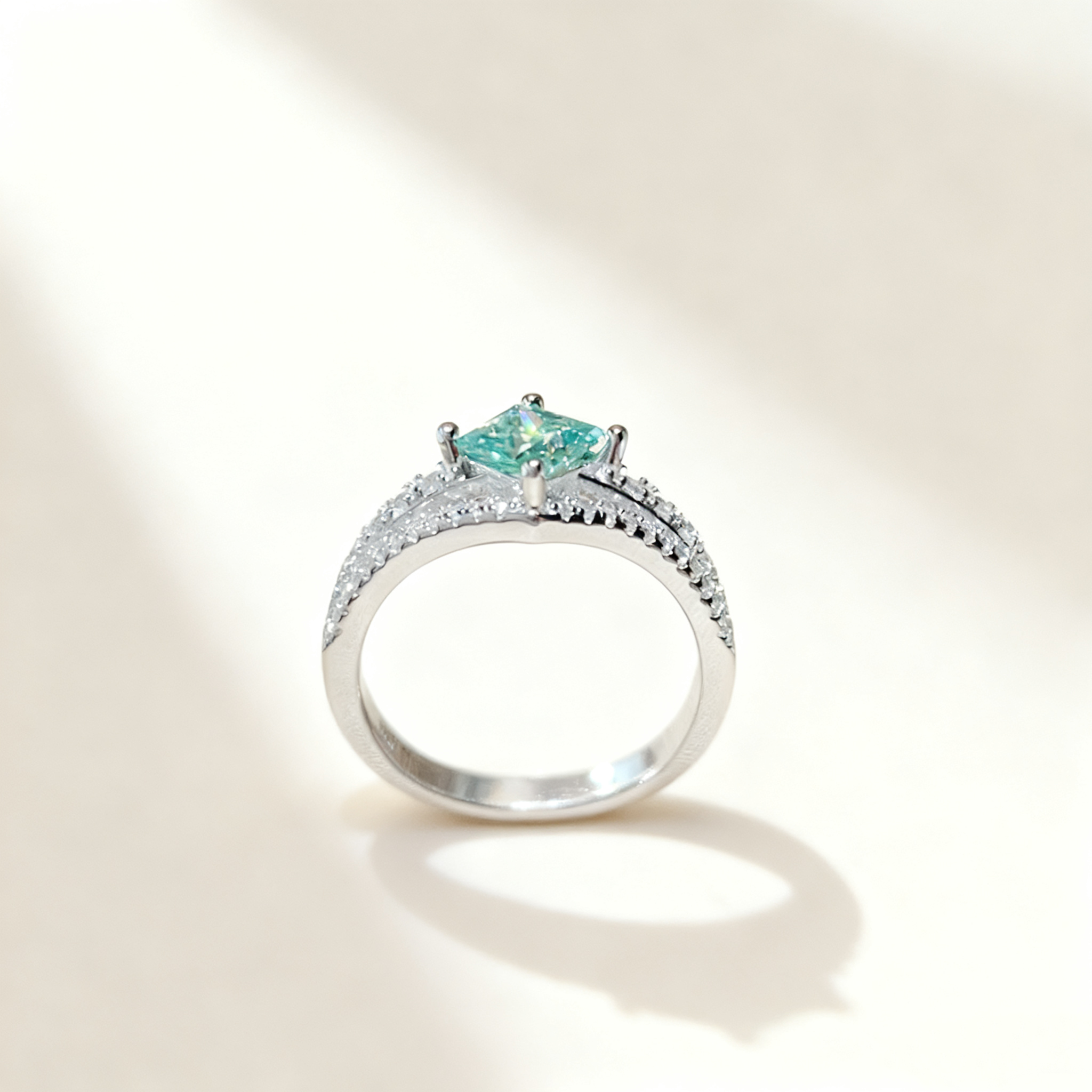A sophisticated ring featuring a 1ct green princess-cut Moissanite as the centerpiece, complemented by smaller pavé-set Moissanite accent stones for extra sparkle. Crafted in S925 silver with luxurious 18K white gold plating, this ring showcases a modern, geometric elegance, perfect for daily wear or special occasions.