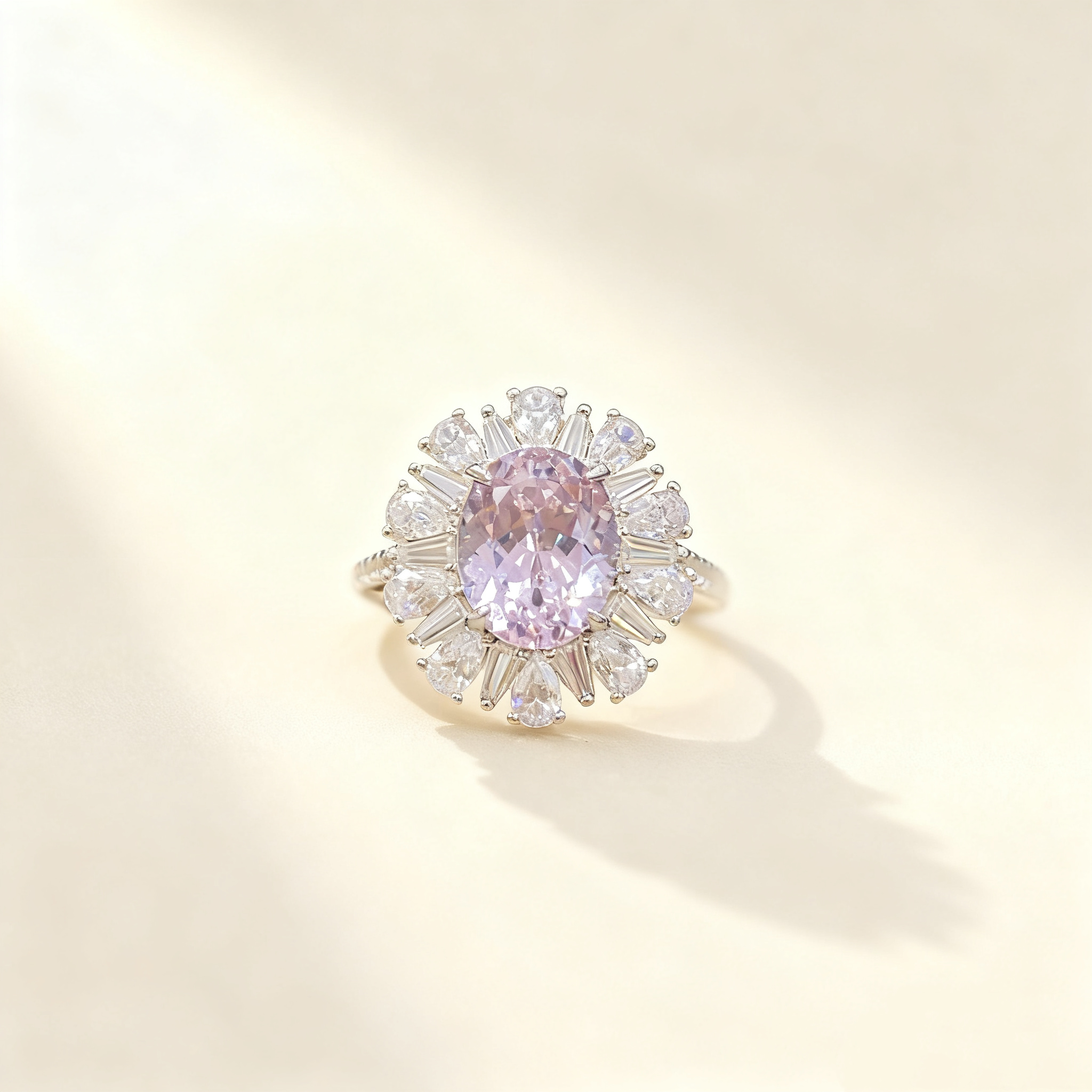 An elegant ring featuring a 3ct light purple oval-cut Moissanite as the centerpiece, complemented by smaller pavé-set white Moissanite accent stones. Crafted in S925 silver with luxurious 18K white gold plating, this ring offers a sophisticated and feminine touch, perfect for daily wear or special occasions.