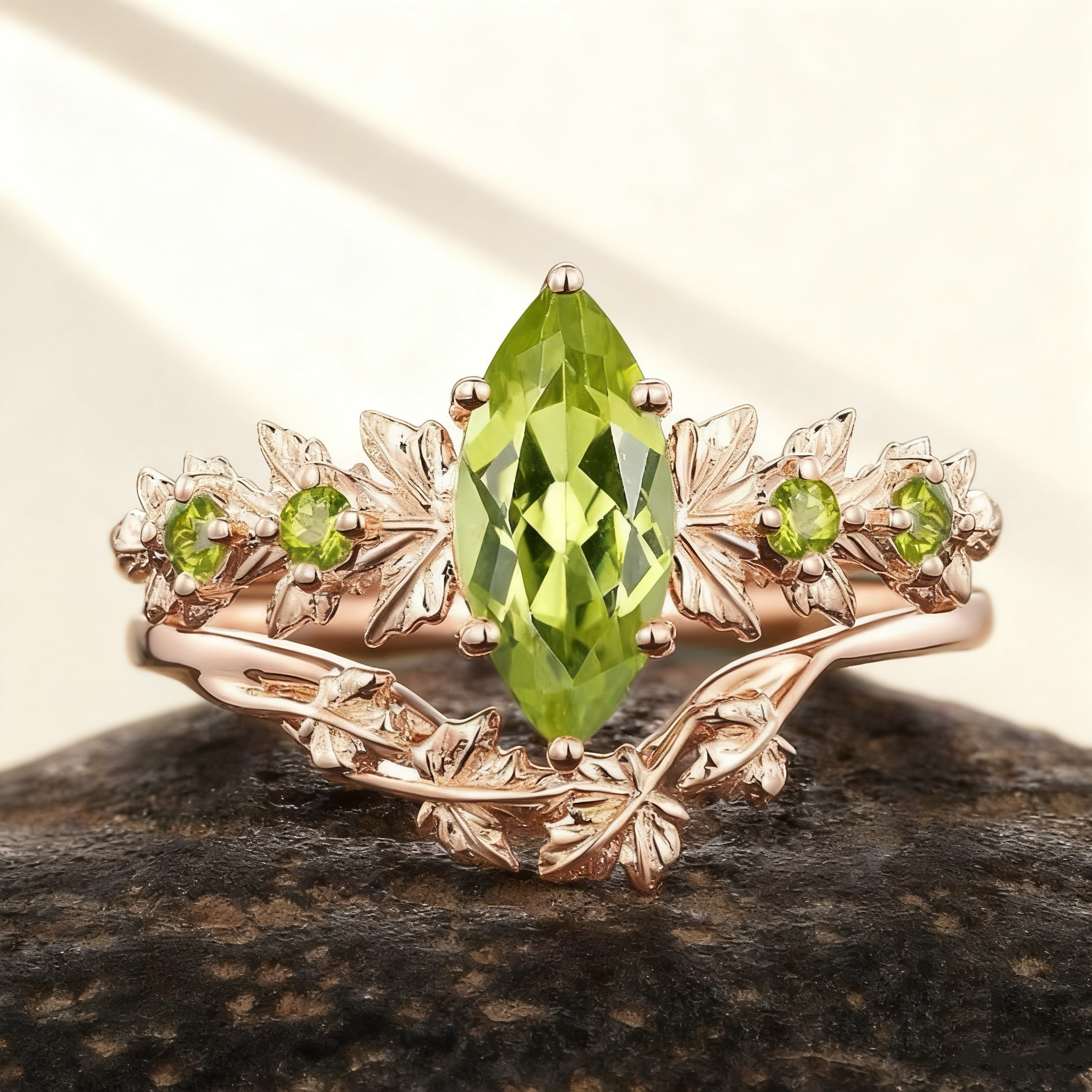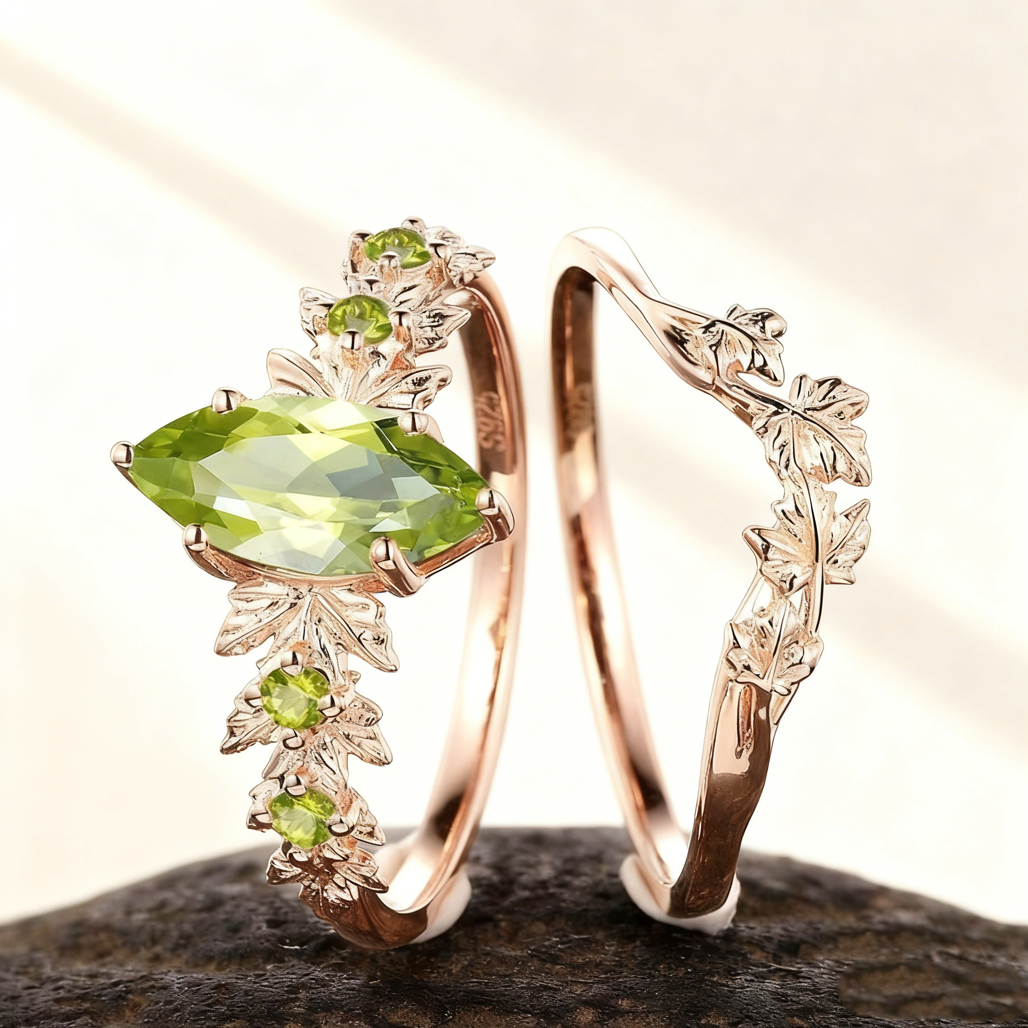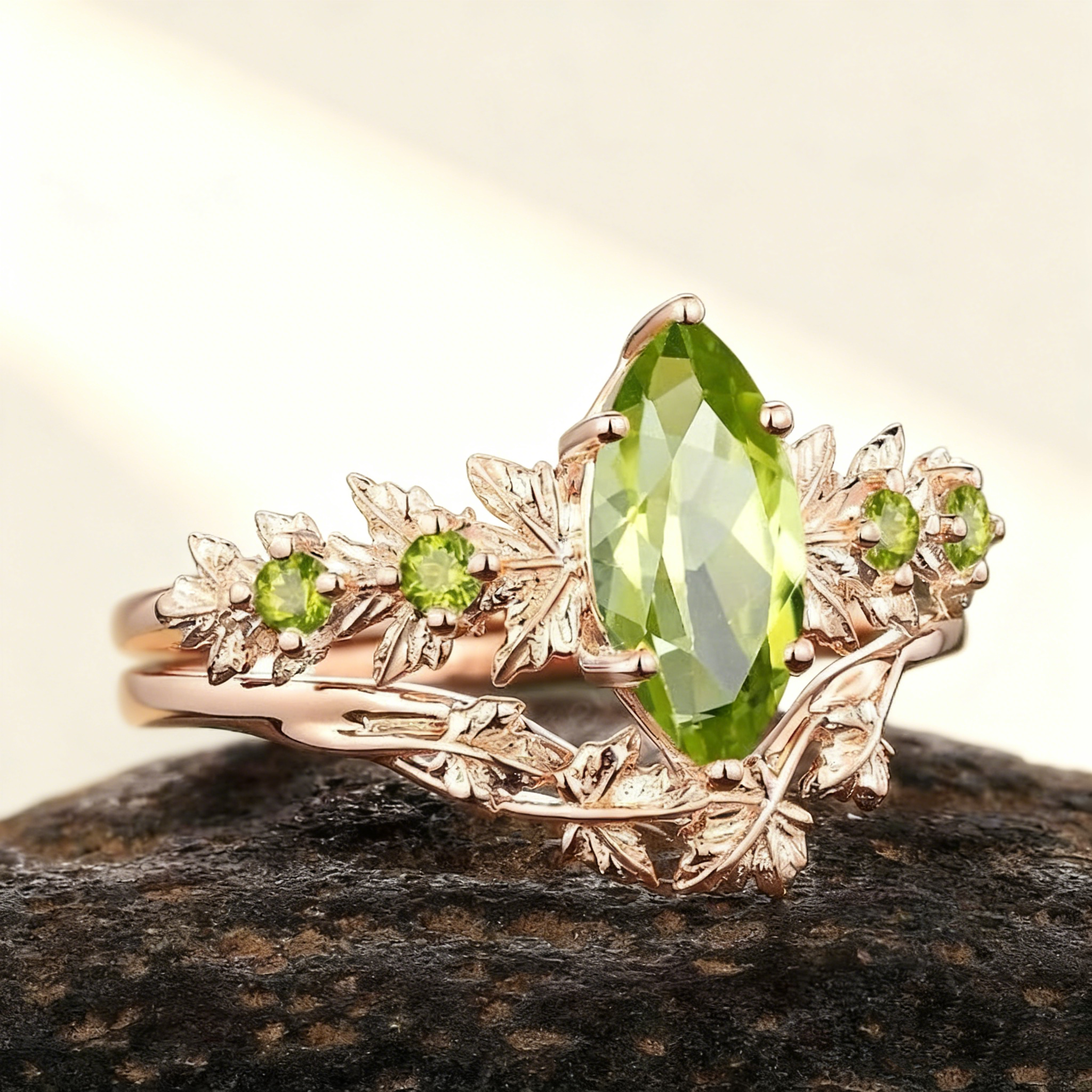 A charming double-ring set featuring marquise-cut green CZ as the centerpiece, accented with four smaller green CZ stones in a delicate floral design. Crafted in 925 sterling silver with rose gold plating, these stackable rings add a fresh, elegant touch to any outfit, perfect for daily wear or special occasions.