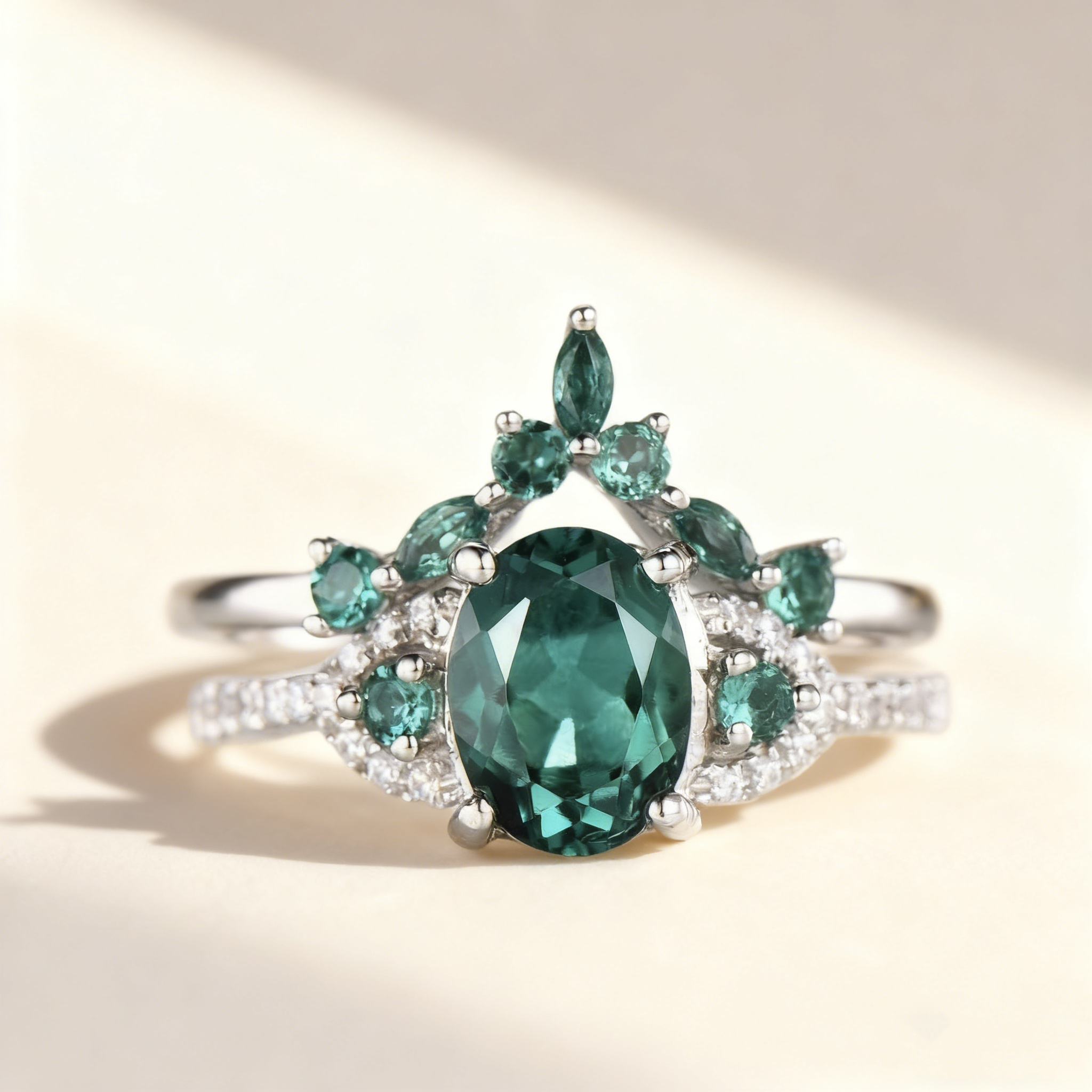 A stunning crown-style ring set featuring a single oval green gemstone as the centerpiece, accented with smaller green gemstones and sparkling green and clear Cubic Zirconia (Simulated Diamond). Crafted in 925 sterling silver, this regal design is perfect for stacking or wearing alone, adding elegance and charm to any occasion.