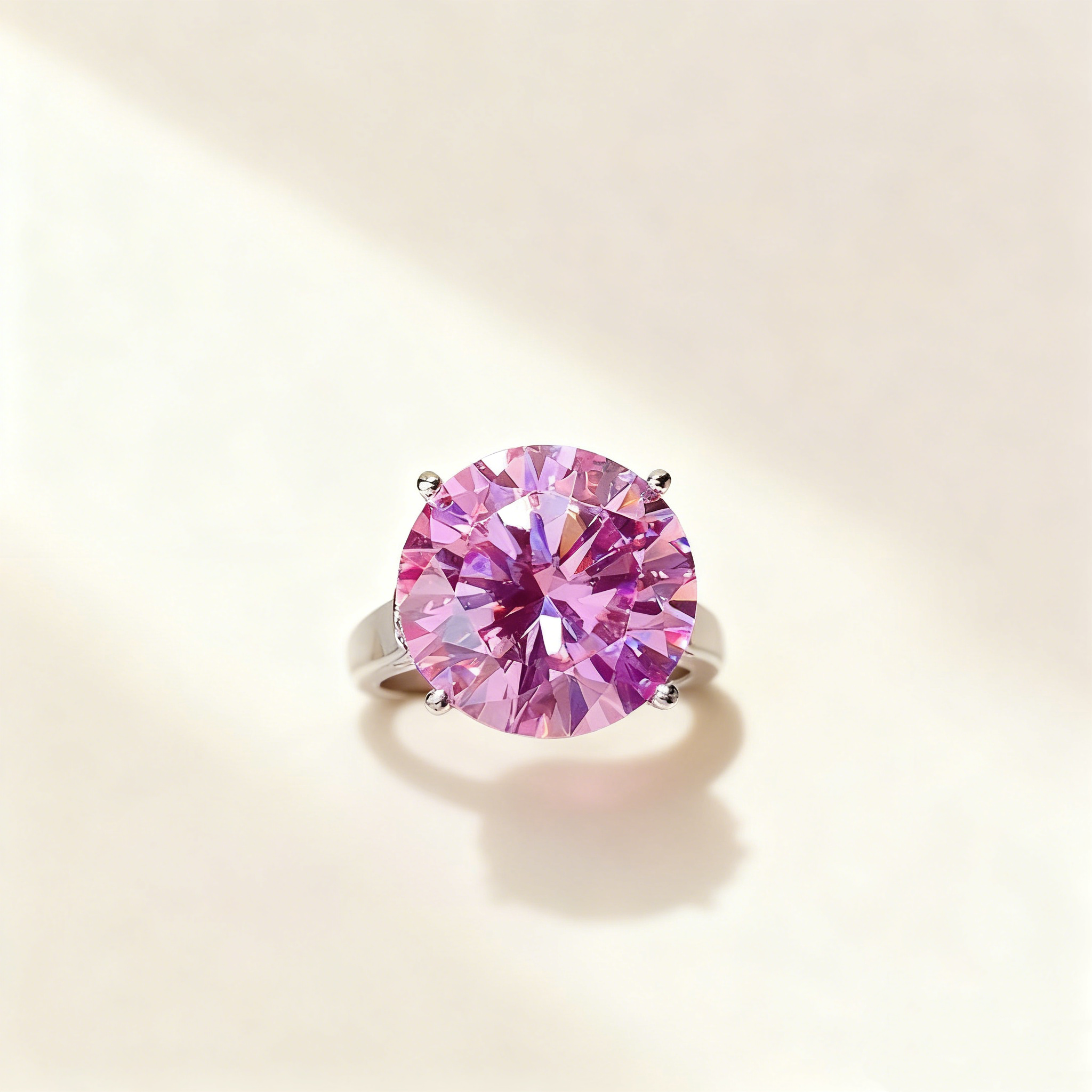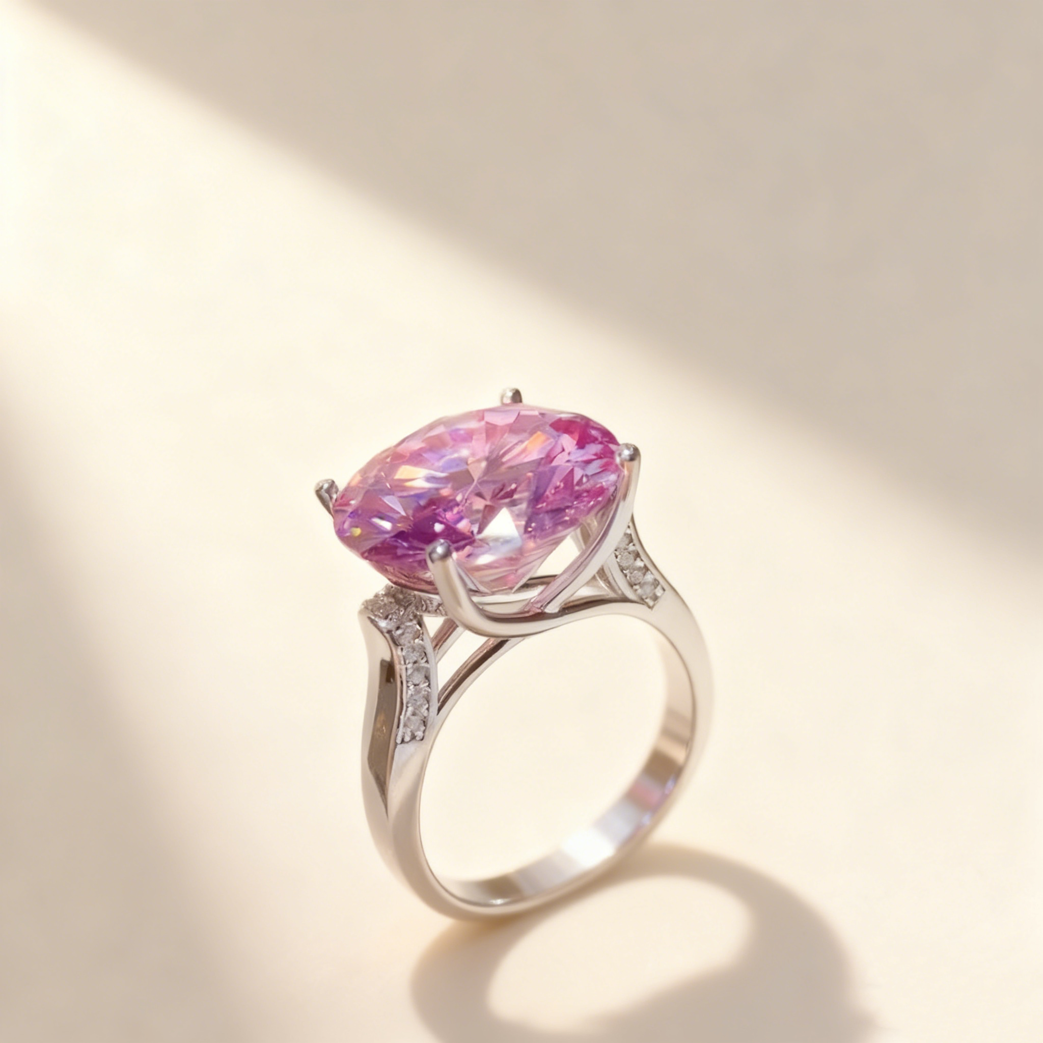 A timeless and elegant design, the Royal Blush Moissanite Ring features a stunning D Color Moissanite in a delicate pink hue, set in S925 silver with luxurious 18K white gold plating. The Moissanite boasts D color and VVS1 clarity, with an expertly cut 8 Hearts & 8 Arrows pattern and 3EX cut for unparalleled brilliance and sparkle. Complemented by small Moissanite accent stones, this exquisite piece adds a touch of refinement to any occasion. Available in 1ct and 2ct carat sizes and a range of sizes, this luxurious ring is a perfect blend of beauty and sophistication.